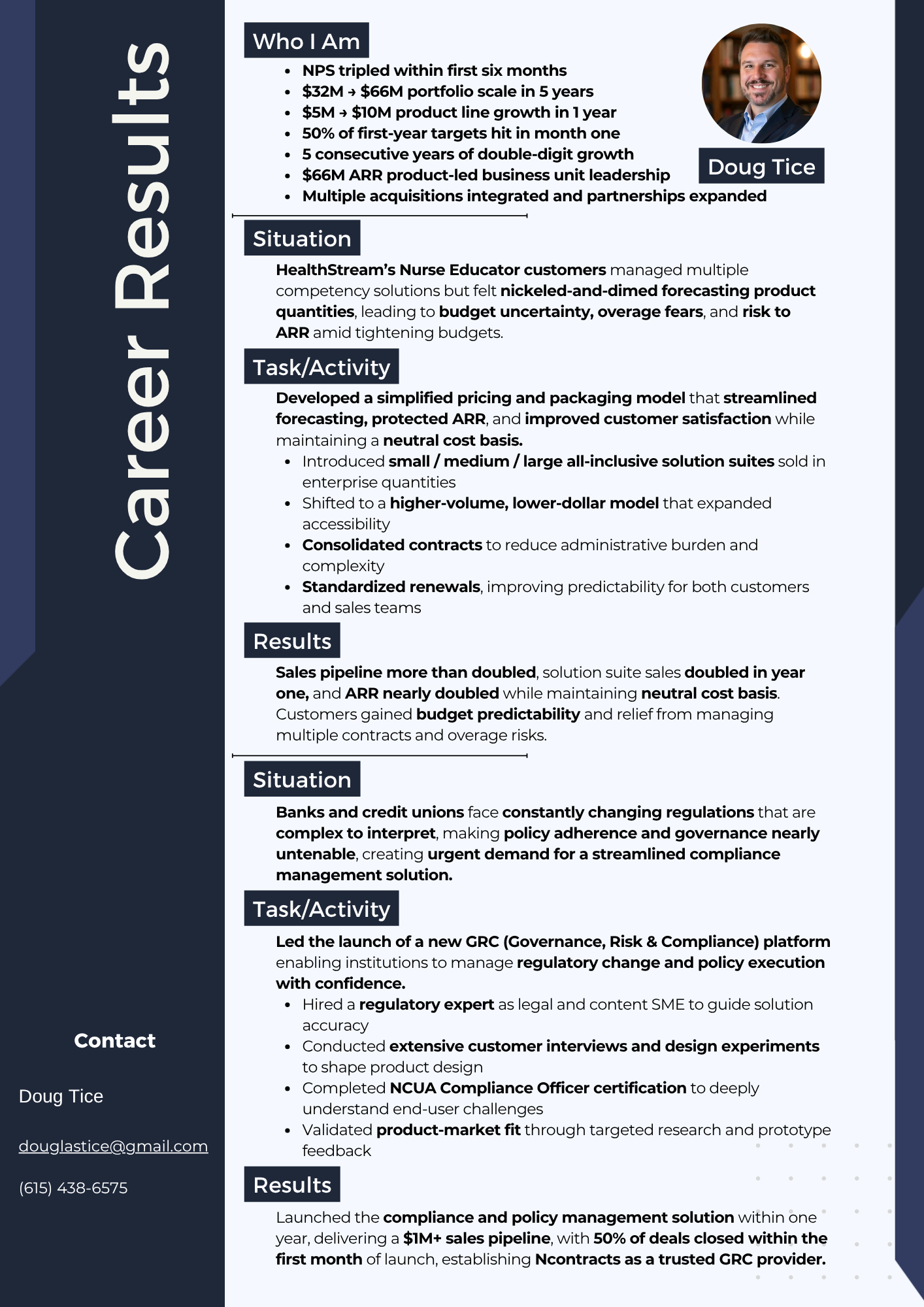 Career highlights include scaling a $32M portfolio to $66M in under five years and doubling a product line from $5M to $10M in one year.